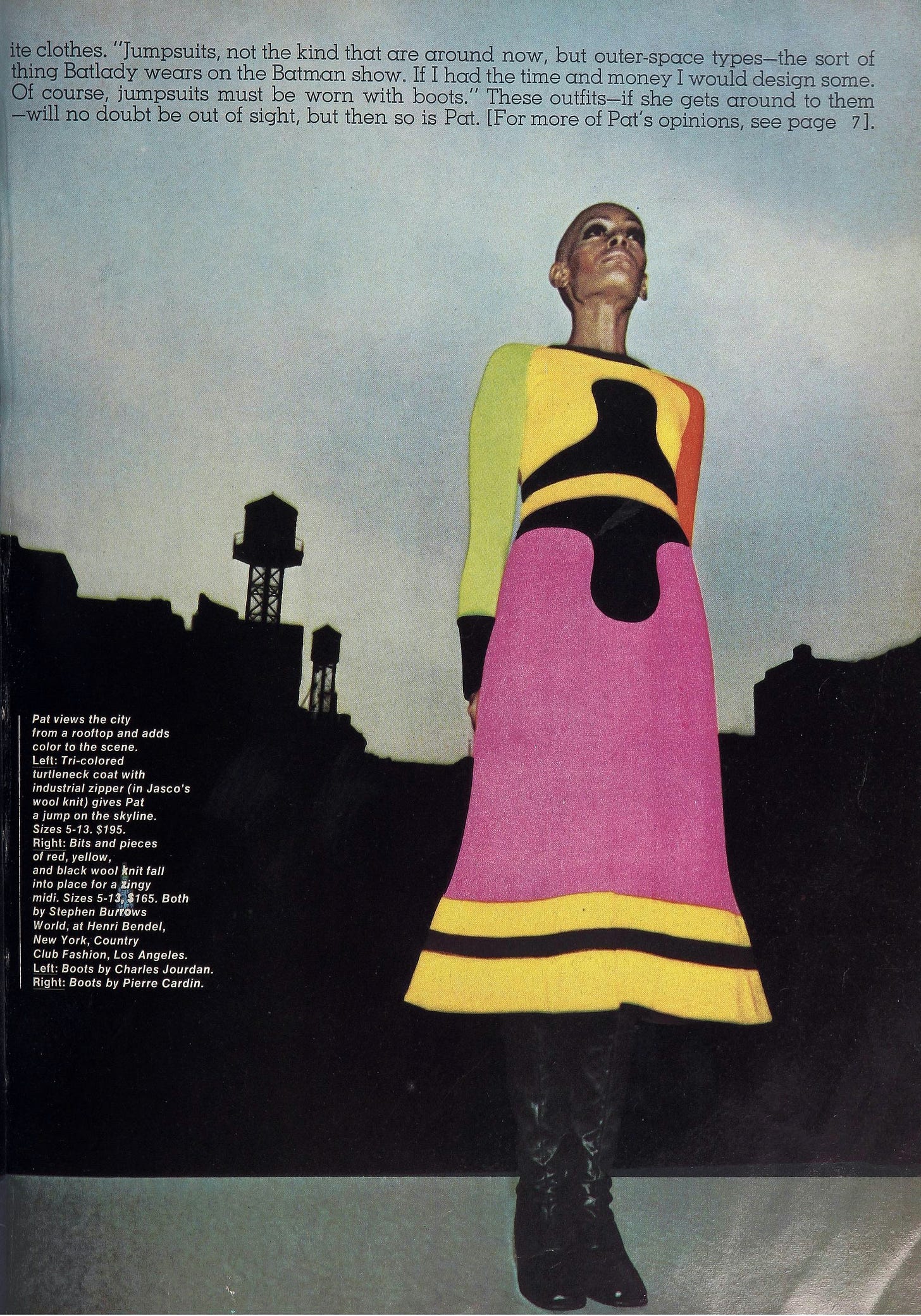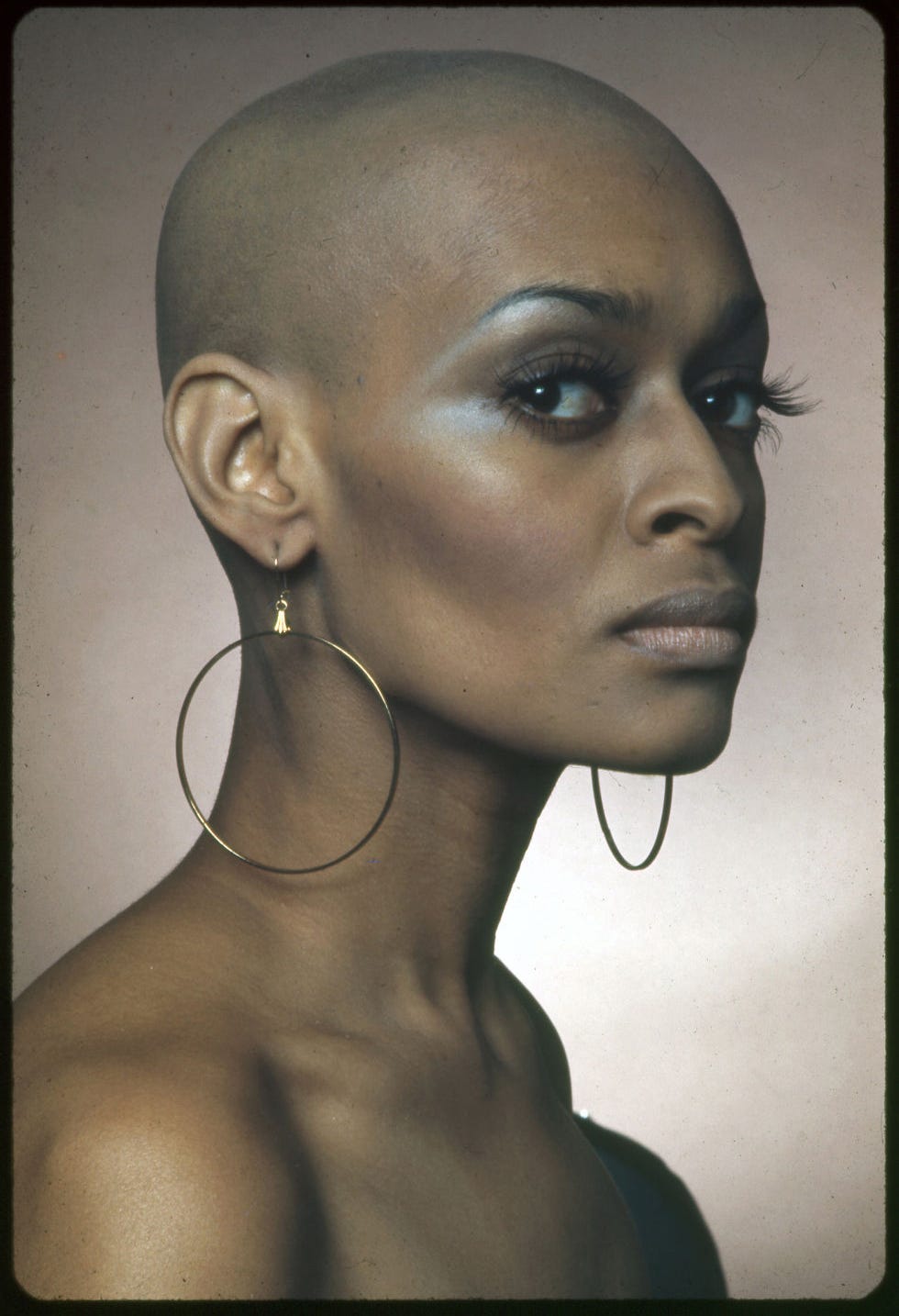 Born and raised in Harlem’s Sugar Hill neighborhood, Pat’s ancestry is Black, Nanticoke Lenni-Lenape, and Powhatan. Caught between the wishes of her mother and her own creative energy, she became a nurse before leaving to dance with Nigerian drummer Babatunde Olatunji. A chance meeting in Greenwich Village made her a model. At the time, Pat’s hair was natural—something she covered up with a wig for her modeling jobs. Though she was one of her agency’s top earners (alongside Twiggy), Pat wasn’t happy with the cultural constraints and ideas around “good hair” and “bad hair” so she shaved it all off. At a fitting for Stephen Burrows, her wig fell off—when he asked her to walk in his show with her bald head exposed, Pat’s career went into overdrive. Suddenly news companies all around the world wanted to interview her as a symbol of a new form of beauty—though Pat herself said that she didn’t “want to be a symbol. If you straighten your hair, you’re trying to be white. If you wear it natural, it’s Black power. We Blacks have to go through our African thing, our slave thing. Eventually, we’ll find our own answer about hair.”