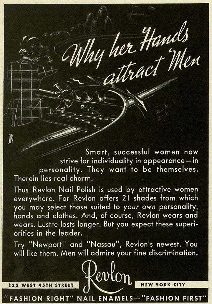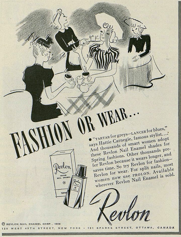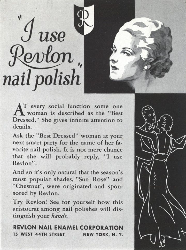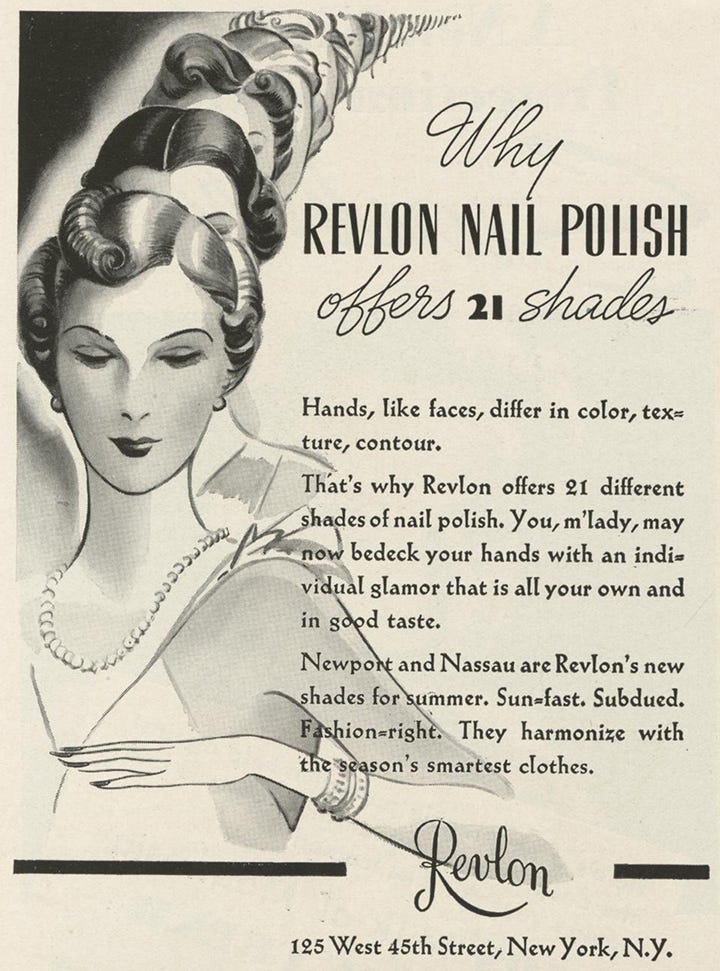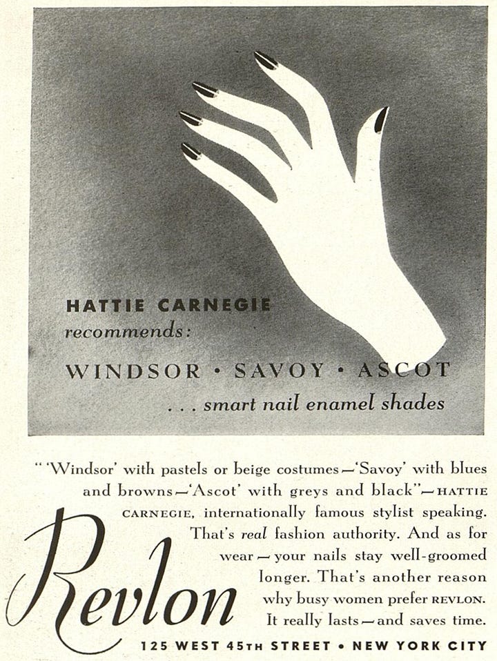 Revlon’s early ads spoke of matching nails to your clothes and to “flatter the individual coloring, texture and contour of your hands.” In 1938, they brought in famed fashion designer Hattie Carnegie to recommend certain color polishes to harmonize with different colour outfits.