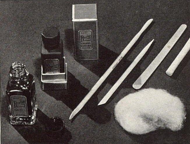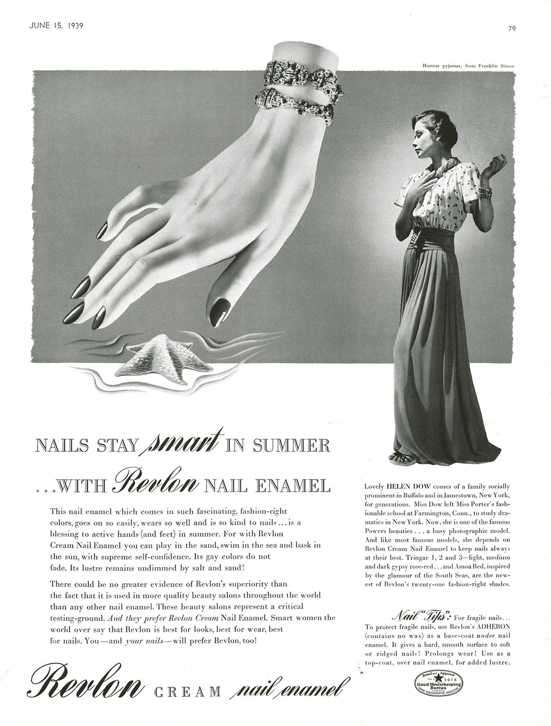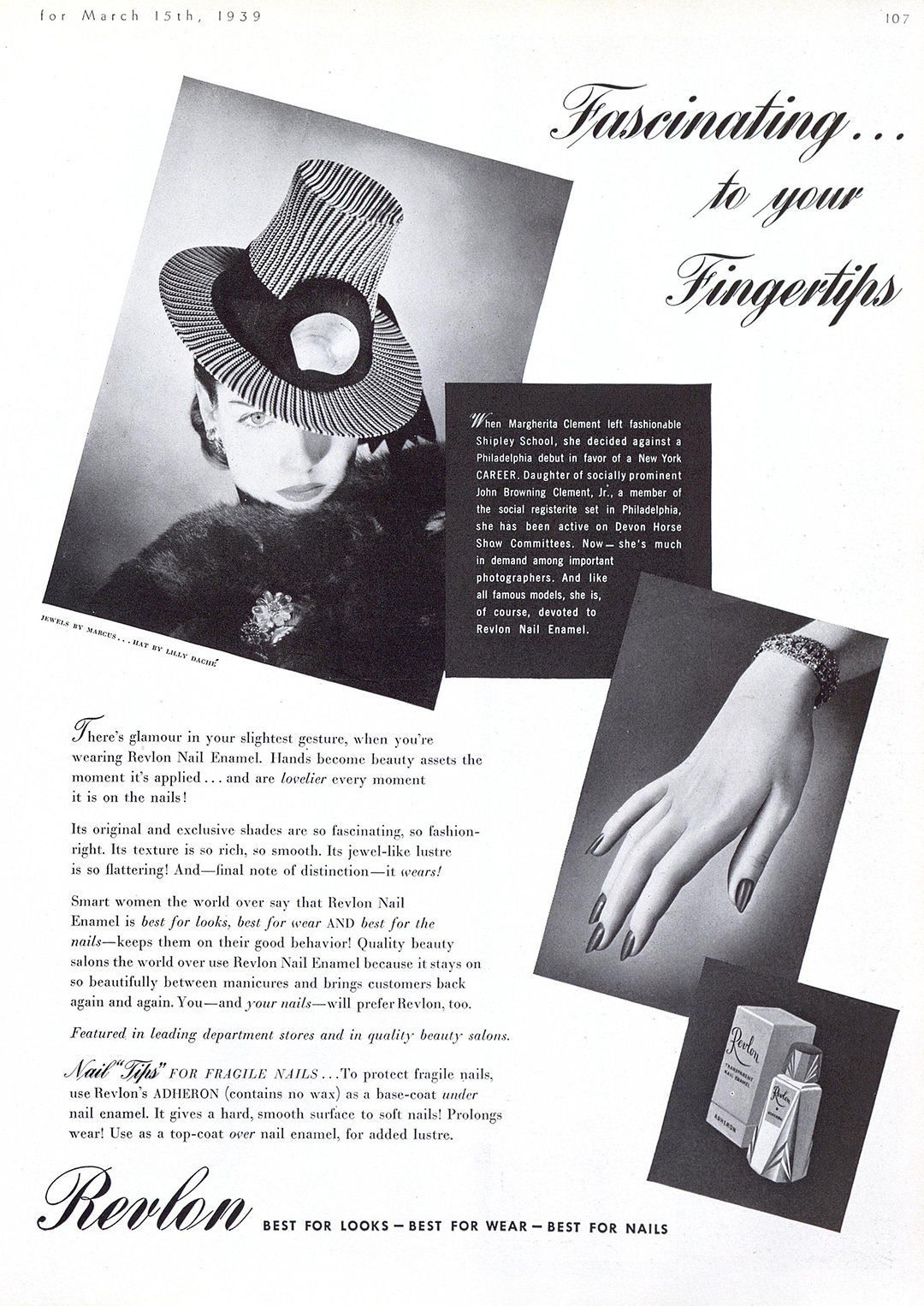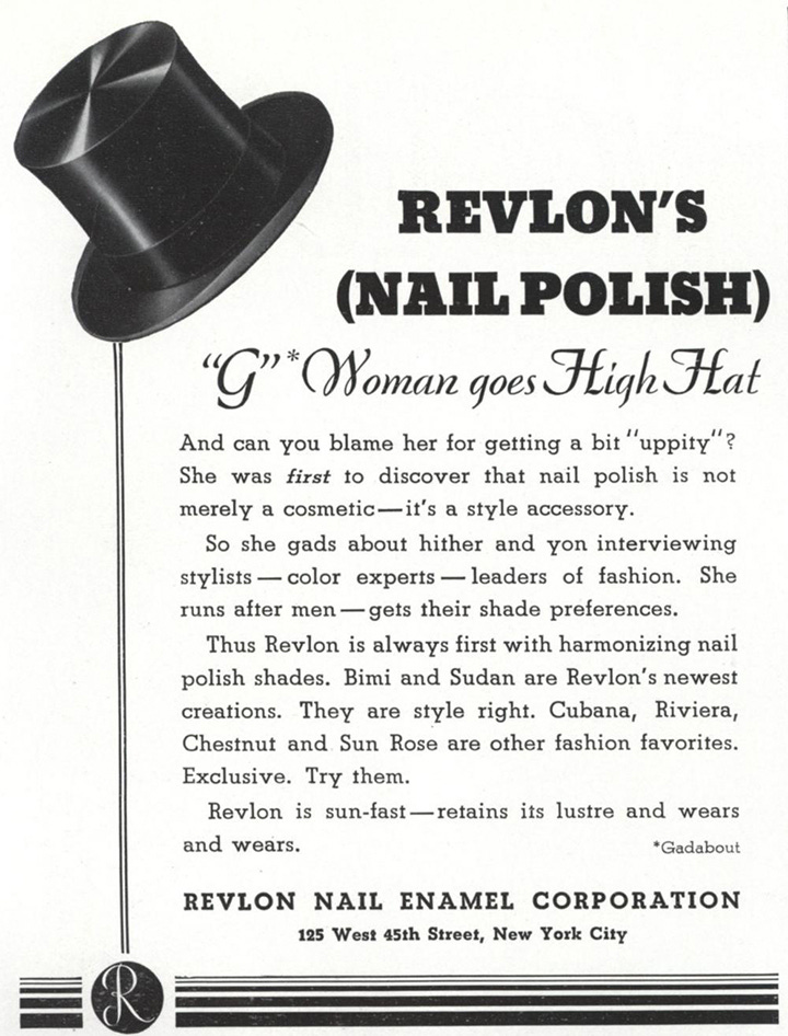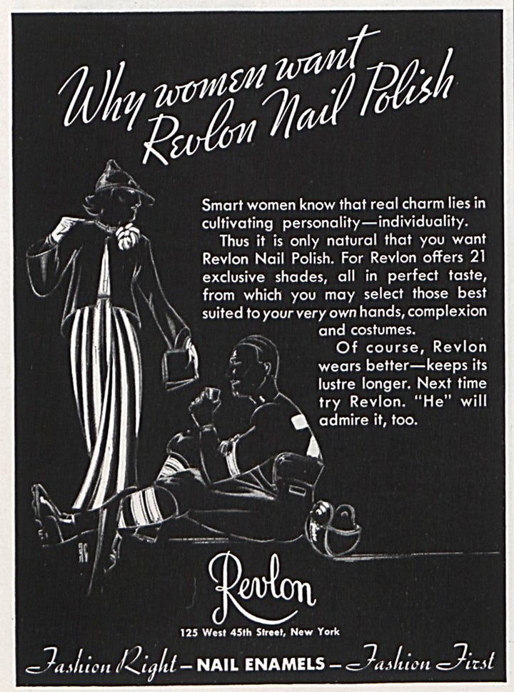 Revlon’s early ads spoke of matching nails to your clothes and to “flatter the individual coloring, texture and contour of your hands.” In 1938, they brought in famed fashion designer Hattie Carnegie to recommend certain color polishes to harmonize with different colour outfits.