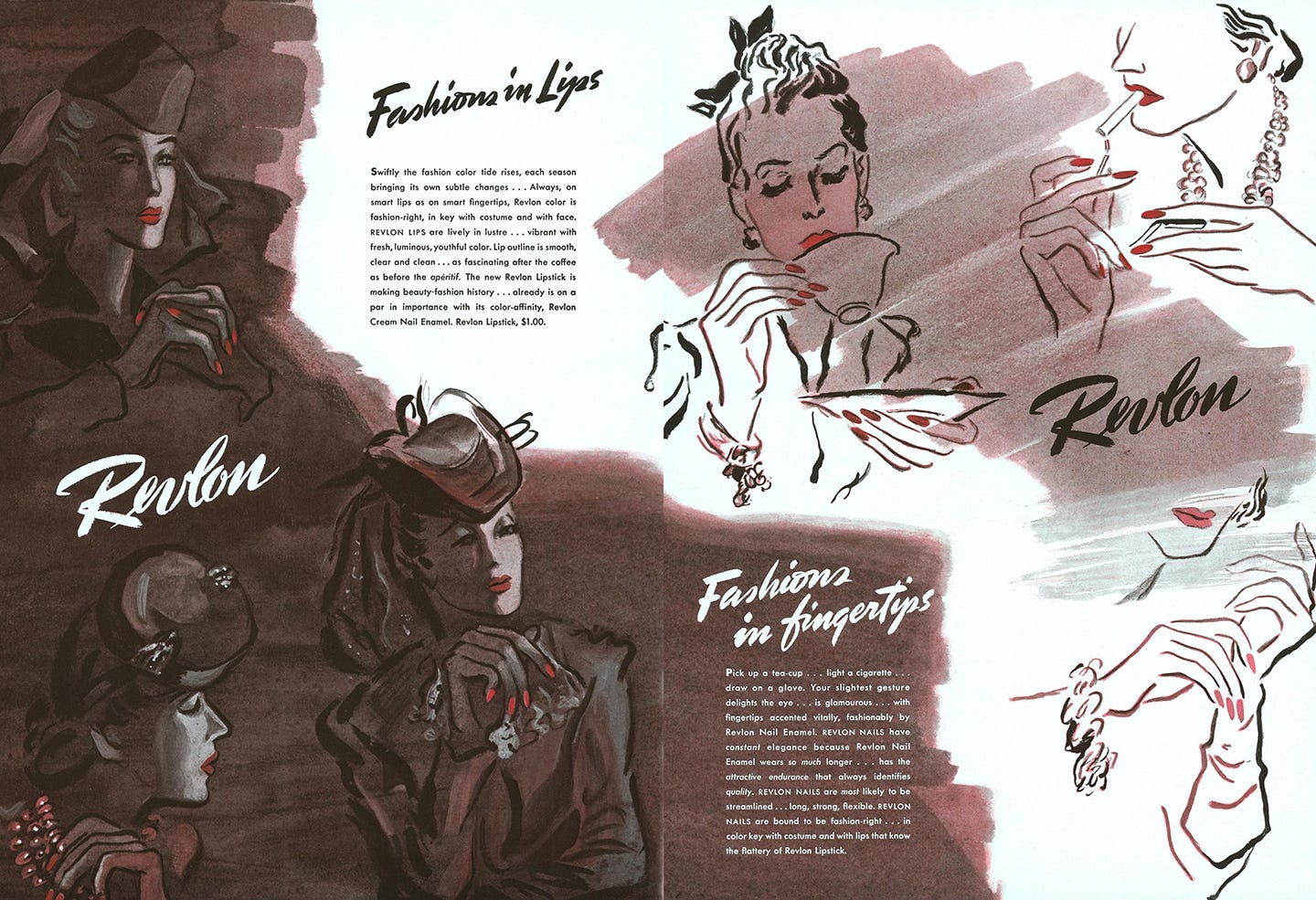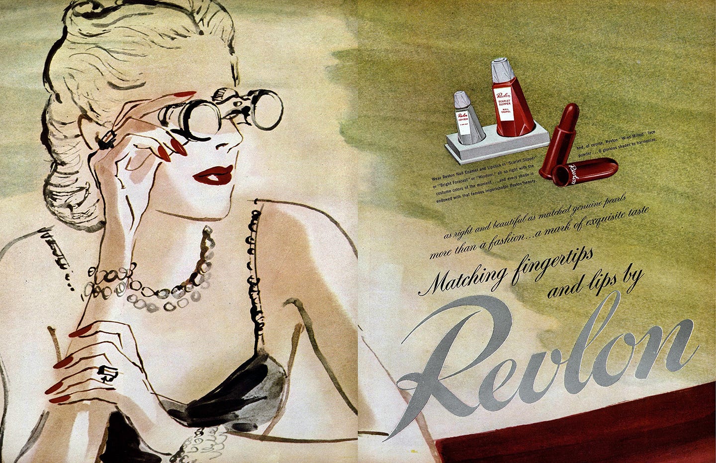 In 1940 Revlon came out with lipsticks in the exact same shades as some of their polishes, setting a trend for perfectly matching the two. As Tobias points out, Revlon wasn’t the first to come out with matching lip and nail colours—Revson copied this idea from another company that had used the theme in their ads a few years previously. But like all genius copiers, he did it better—full colour, illustrated double-page spreads in the glossy fashion magazines selling class for the price of a lipstick: “Always, on smart lips as on smart fingertips, Revlon color is fashion-right, in key with costume and with face...” Matching fingertips and lips were sold as “as right and beautiful as matched genuine pearls… more than a fashion… a mark of exquisite taste.” As new colours were added to their line-up, they were accompanied by colour ad campaigns that vibrantly drew in a clientele already now used to exclusively wearing Revlon on their tips and their lips.