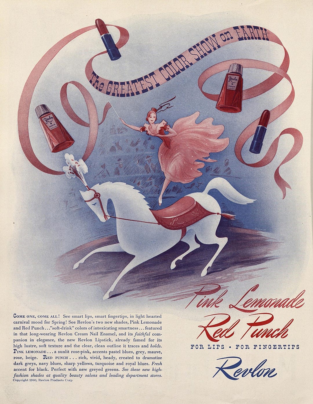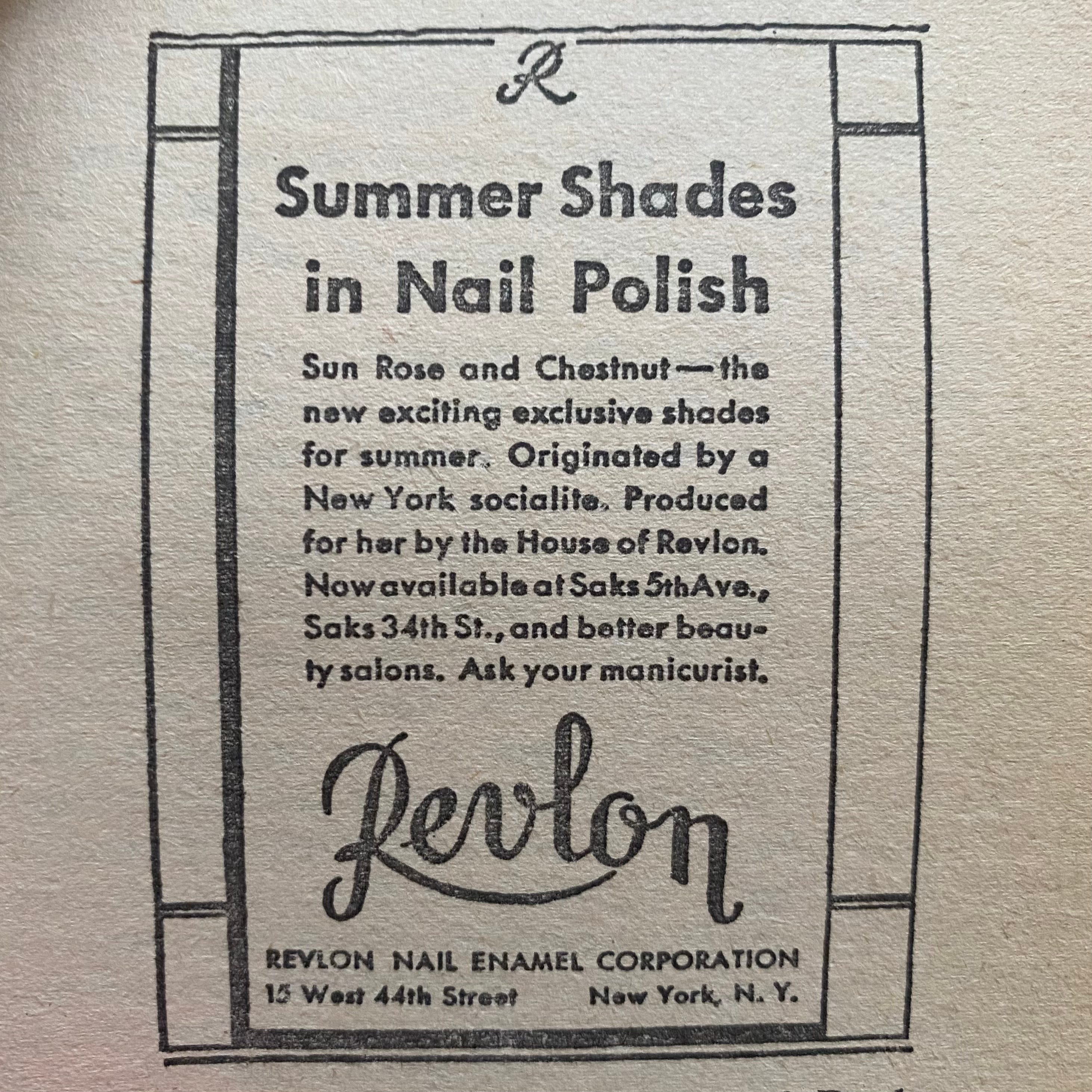 These ads led to the launch of Revlon’s famed colour promotions in 1944—the shade names and their ad campaigns inextricably linked with Revlon and its success. More on those in the next newsletter.