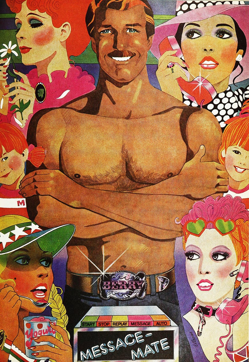 If you’ve been reading or following my work for a while, it will be no surprise that I love illustrations and speaking with illustrators. For the Sighs and Whispers podcast, I’ve previously interviewed illustrators Barry Zaid, Emanuel Schongut, Barbara Nessim, David Lance Goines, Sandy Dvore, Mel Odom, and the estate of Richard Bernstein. One illustrator whose work I continually returned to and hoped to speak with was Richard Ellescas. I first came across Dick’s illustrations in mid-1970s issues of Cosmopolitan—vibrantly colored, often sexually charged drawings of beautiful men and women, swirled together in a skillful mixture of Art Deco, Art Nouveau, and psychedelic art. As Helen Gurley Brown described in one of her editor’s letters, “Los Angeles’ Dick Ellescas specializes in glamorous women, brilliant color – and we gasp (pleasurably) when his work arrives at the office.”